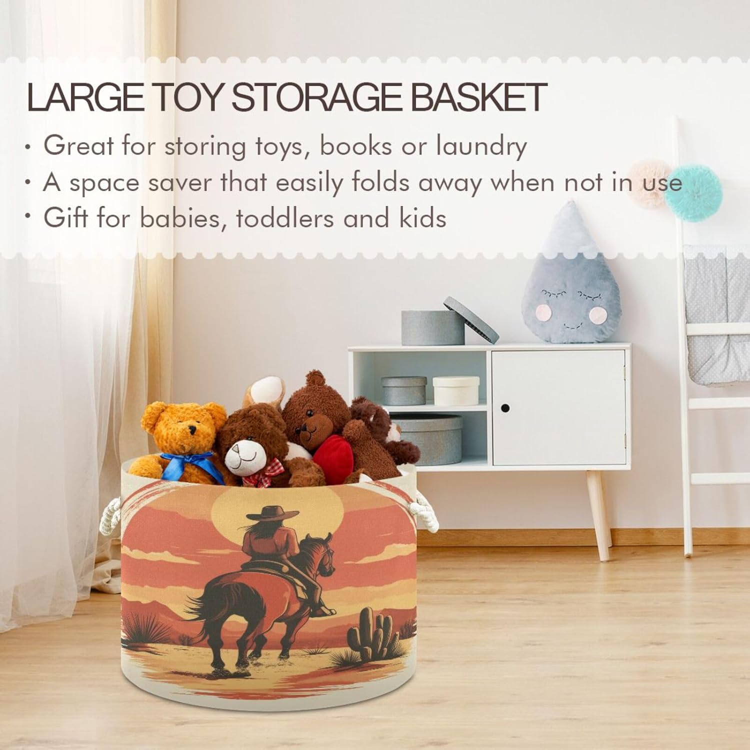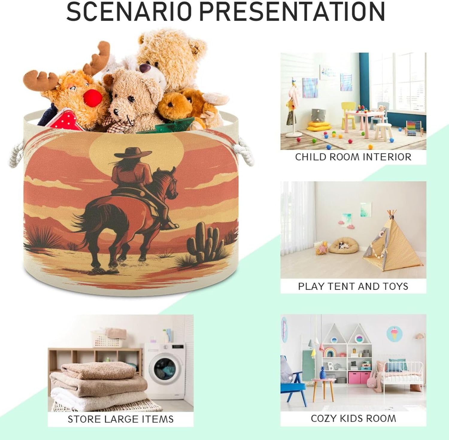 SPECIFICATION Printing: peripheral printing (bottom fixed black, lining fixed white). Material: external canvas, white PE coated fabric for lining, thick cotton rope for carrying handle. Size: 20 inches D, 14 inches H (50.8cm * 35.56cm). Capacity: 72 Liters. Washing: machine washing is not recommended, can be partially hand-washed. FEATURES *Large capacity can hold a week's worth of dirty clothes for a family of four. Makes housework easy. This large cotton storage basket can easily hold toys, clothes, blankets, towels, etc. *No support skeleton used, so it can be folded for storage when not in use. *Waterproof lining can also be used as a laundry basket. *Reinforced cotton rope handle makes transportation easier and more comfortable. *No sharp edges, safer for children to use. APPLICABLE SCENES Bedroom, children's room, closet, bathroom, living room, laundry room and any other place where there is a need to store items. SERVICE We are committed to providing customers with quality products, if our products do not meet your satisfaction, please do not hesitate to contact us directly, we will solve your problems until your satisfaction. Thank you for supporting our products, thank you! :):):)